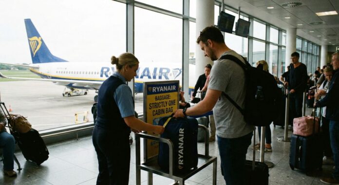 Ryanair staff measure bags at the gate using a metal cage (the “bag sizer”). If your bag exceeds the Ryanair cabin bag size limit, you pay to check it. In 2026, that gate fee is around £70. See Ryanair’s official baggage policy for current fees.