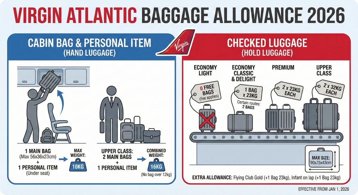 Virgin Atlantic is the UK’s second-largest long-haul airline, flying from London Heathrow, Gatwick, and Manchester to destinations across the USA, Caribbean, India, Middle East, and beyond. The Virgin Atlantic baggage allowance varies significantly by fare type, so it pays to understand what you get before booking.